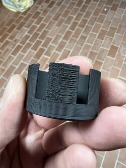 Was noch funktionieren könnte, bevor der "Deckel" des Einschubs gedruckt wird, einen Farbwechsel im Slicer erstellen damit der Drucker kurz Pause macht und dann den Alublock einlegen um diesen als Support zu nutzen. Ich hab das schon öfter mit Muttern oder Magneten gemacht.