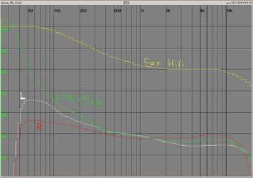 4. Wenn das Linke und rechte Kanal eingestellt ist geht mit dem Subwoofer los. Dafür nutze ich eine dritte Referenzkurve (für die Summe aller eingeschalteten Kanäle). Dabei versuche ich (wenn möglich/ausreichend) die TT-EQs nicht mehr anzufassen und nur die Sub-EQs anzupassen.